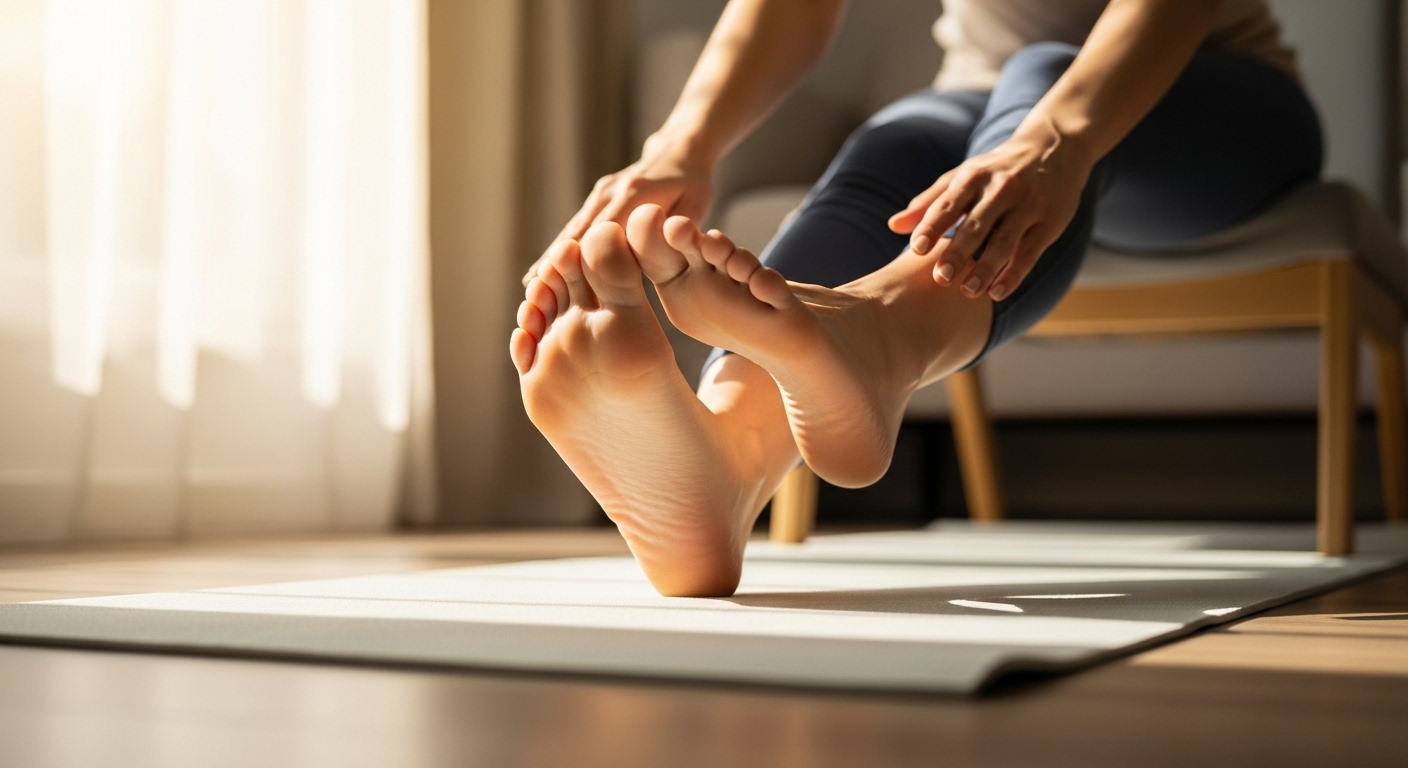 의자에 앉아 발목을 시계 방향과 반시계 방향으로 각각 10번씩 크게 돌려주세요. 발목 주위의 긴장이 풀리면서 신경 압박이 줄어듭니다.