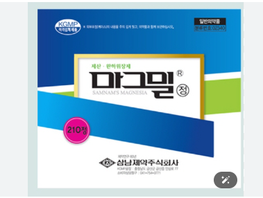 - 성분: 수산화마그네슘 단일 성분으로 제산제 및 변비약으로 쓰임.